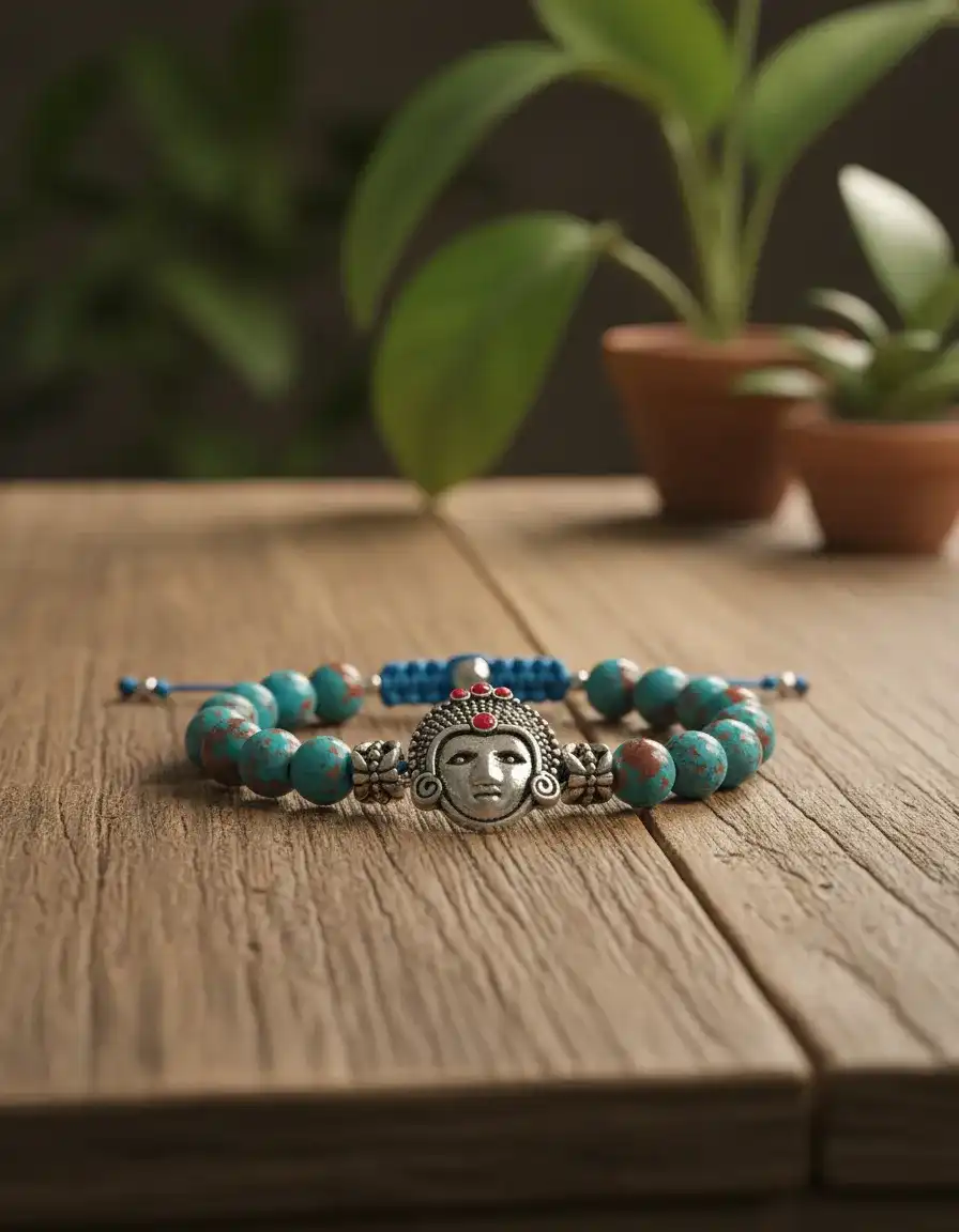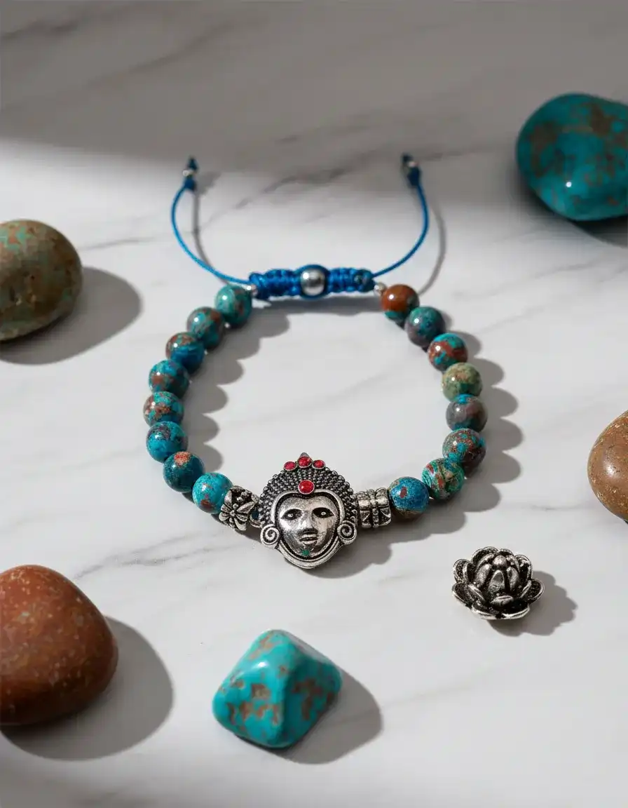 Pulsera de turquesa tibetana, hecha a mano con dije cabeza de Buda. Dije con estrás rojos. La calidad AAA de la turquesa queda expuesta en su brillo.